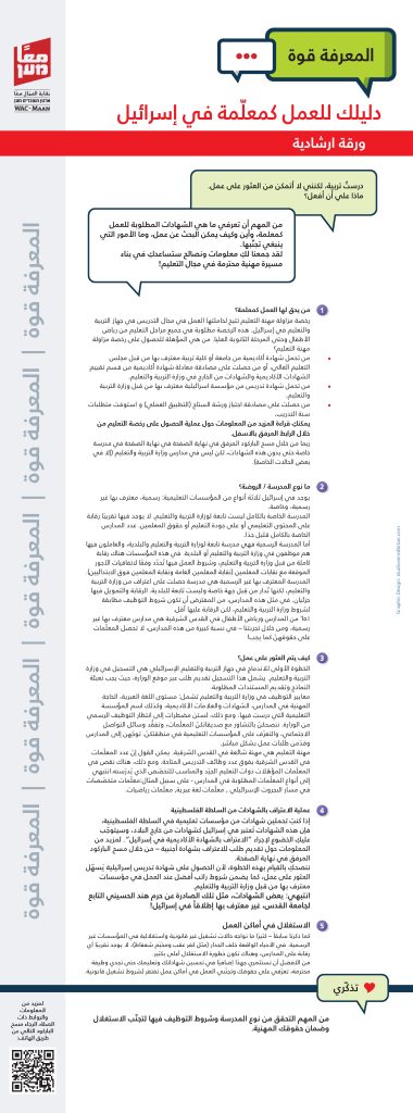 ننصحكِ بالقيام بهذه الخطوة، لأن الحصول على شهادة تدريس إسرائيلية يُسهّل العثور على عمل، كما يضمن شروط راتب أفضل عند العمل في مؤسسات معترف بها من قبل وزارة التربية والتعليم.